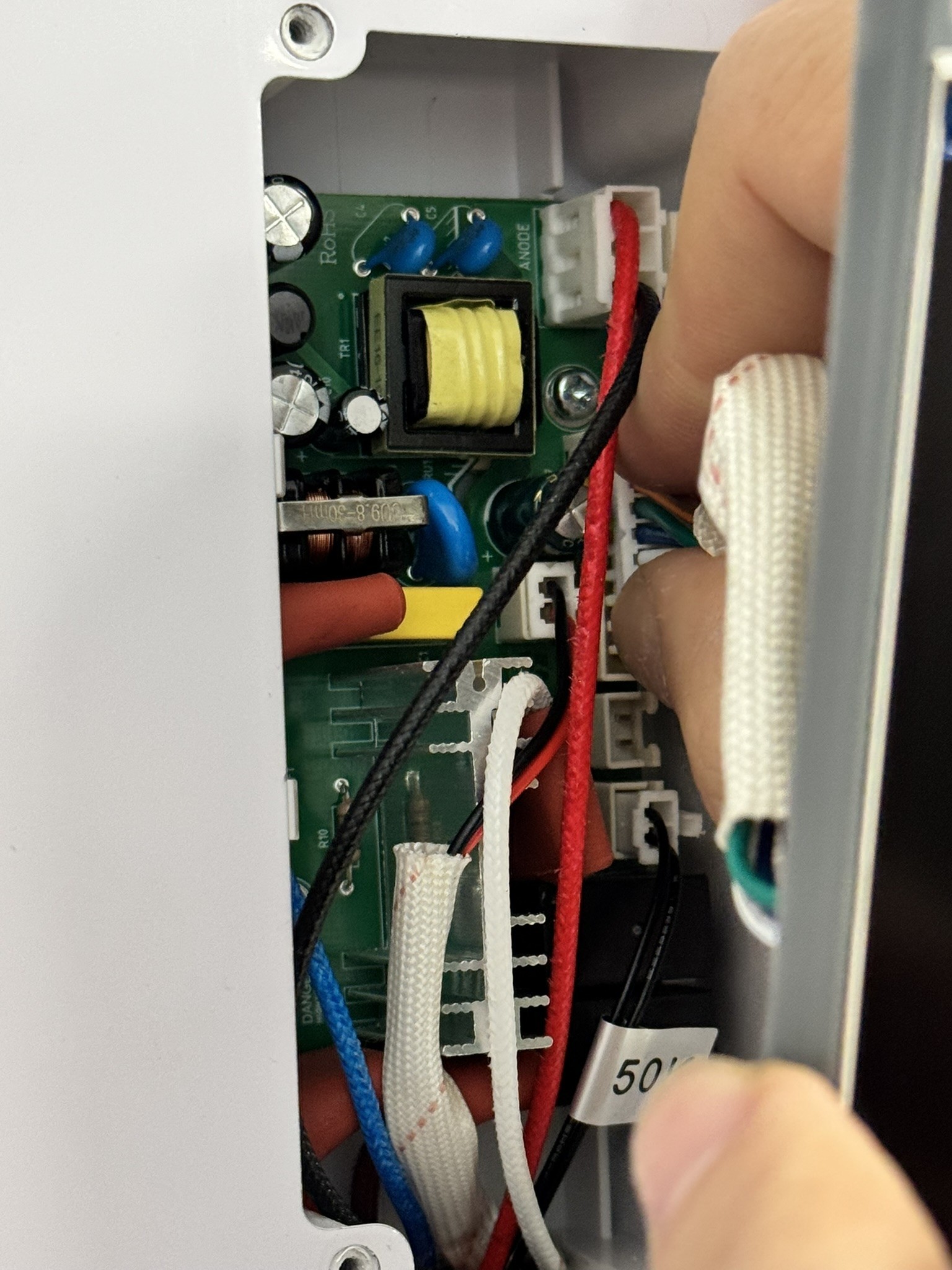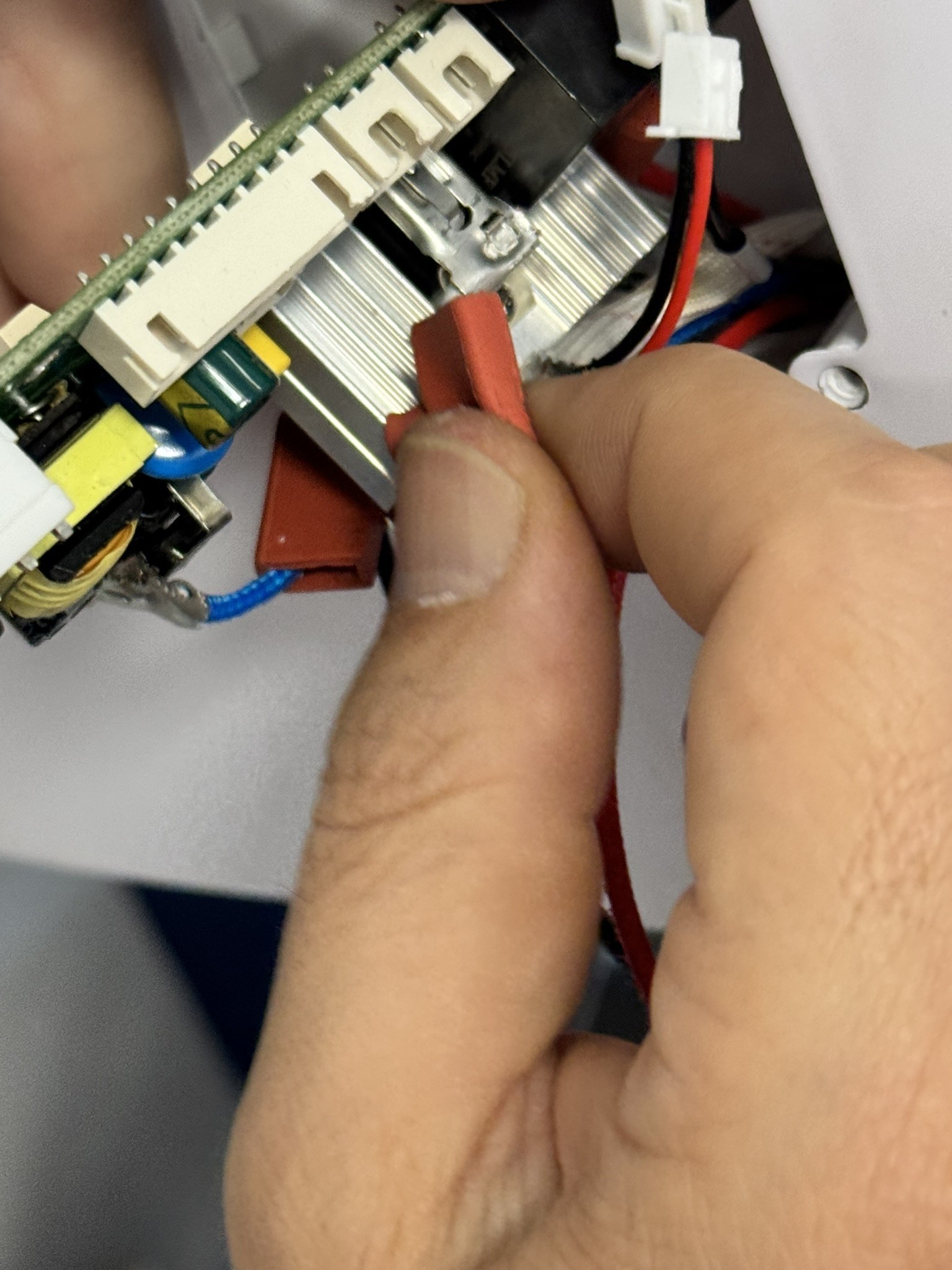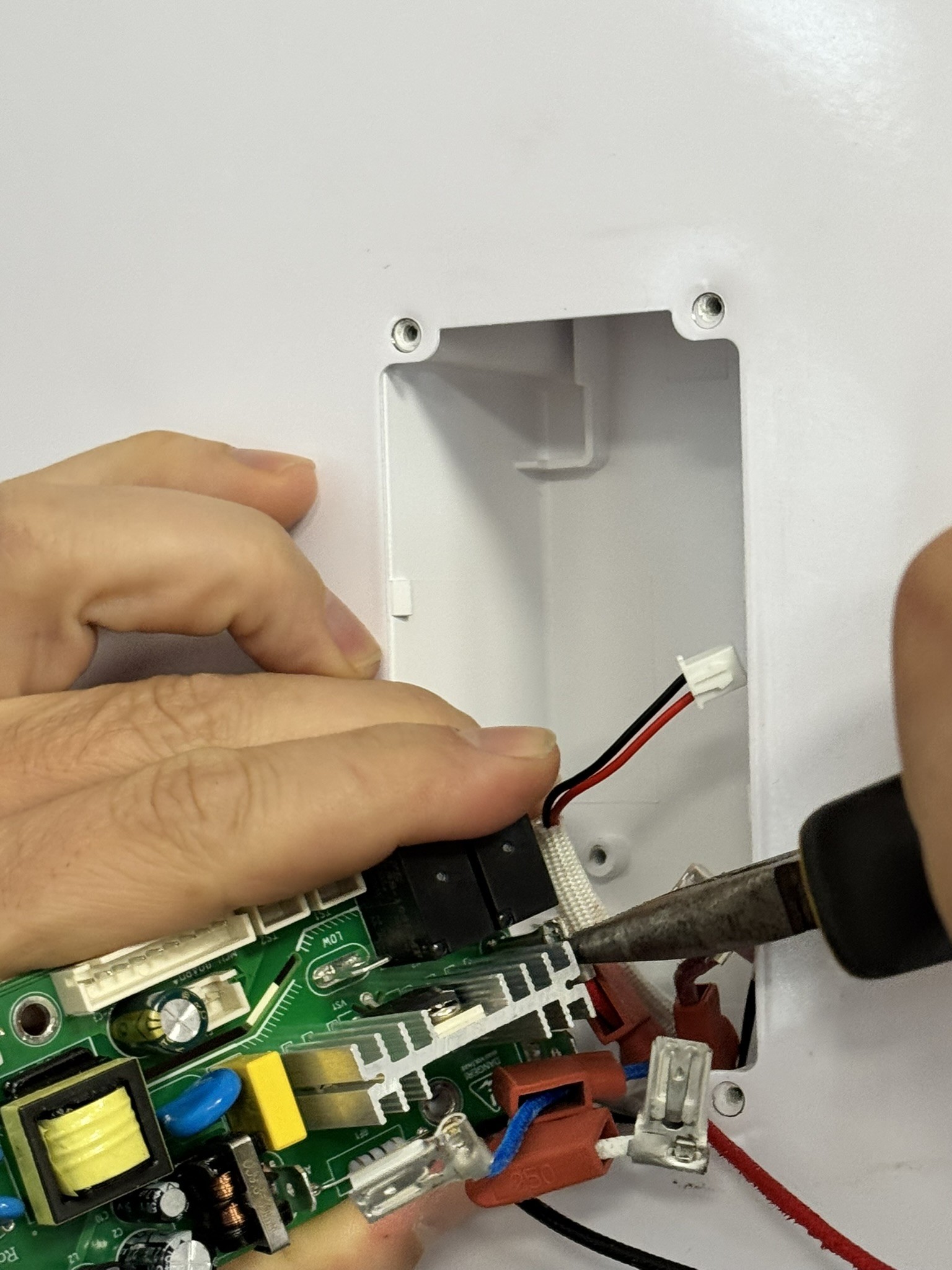 Ezek után óvatosan döntsük ki a panelt, és a fogó segítségével finoman húzzuk le sorban a műanyag csatlakozókat. A legnagyobb csatlakozót egy kis pöcök rögzíti, ezt befelé kell nyomni, hogy kioldjon.